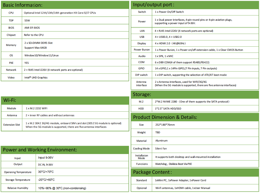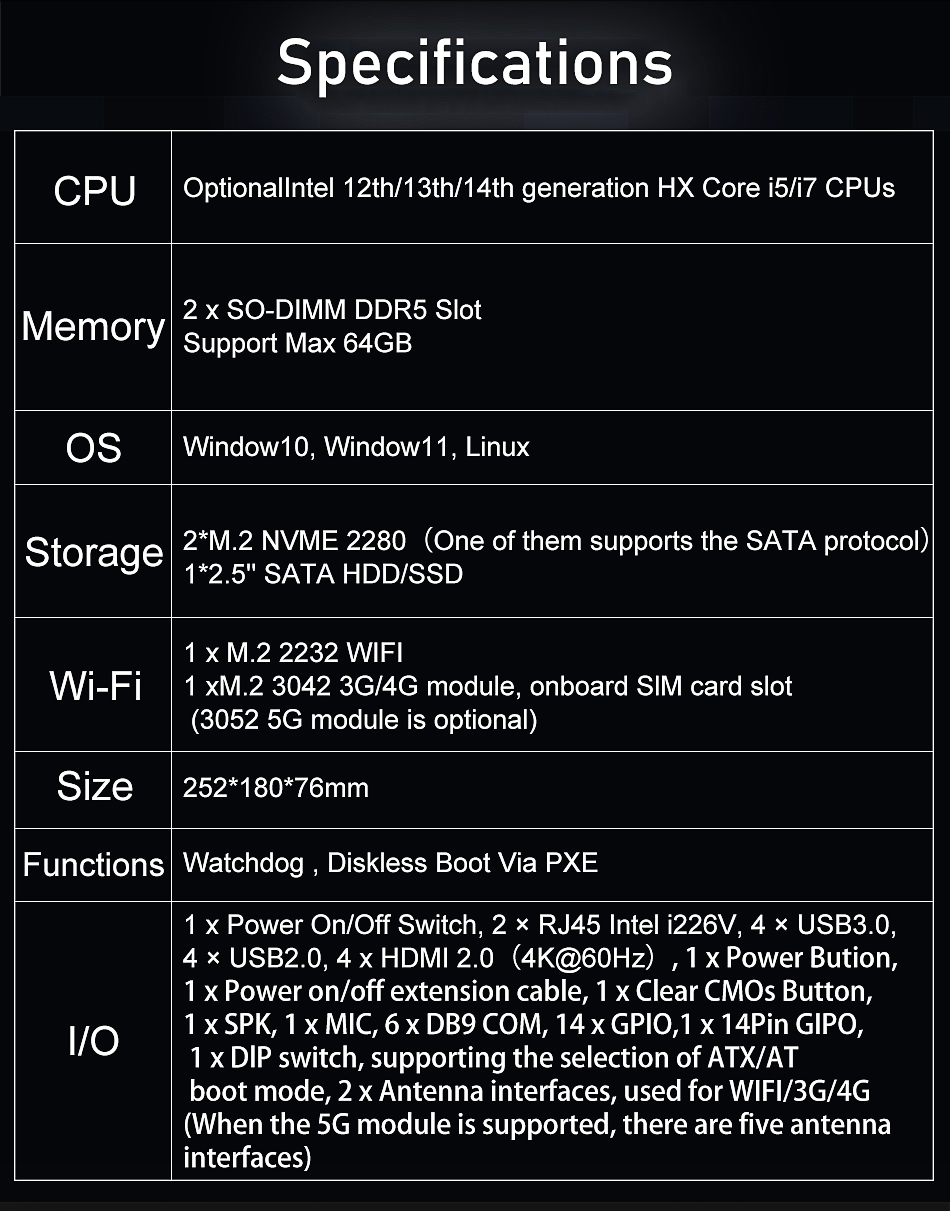 EGLOBAL Fan Intel Core I7-12650HX 14 Cores 20 Threads DDR5 Max 64G NVME SSD Win10/11/Linux OS 4*LAN 6*COM Industrial MIni PC